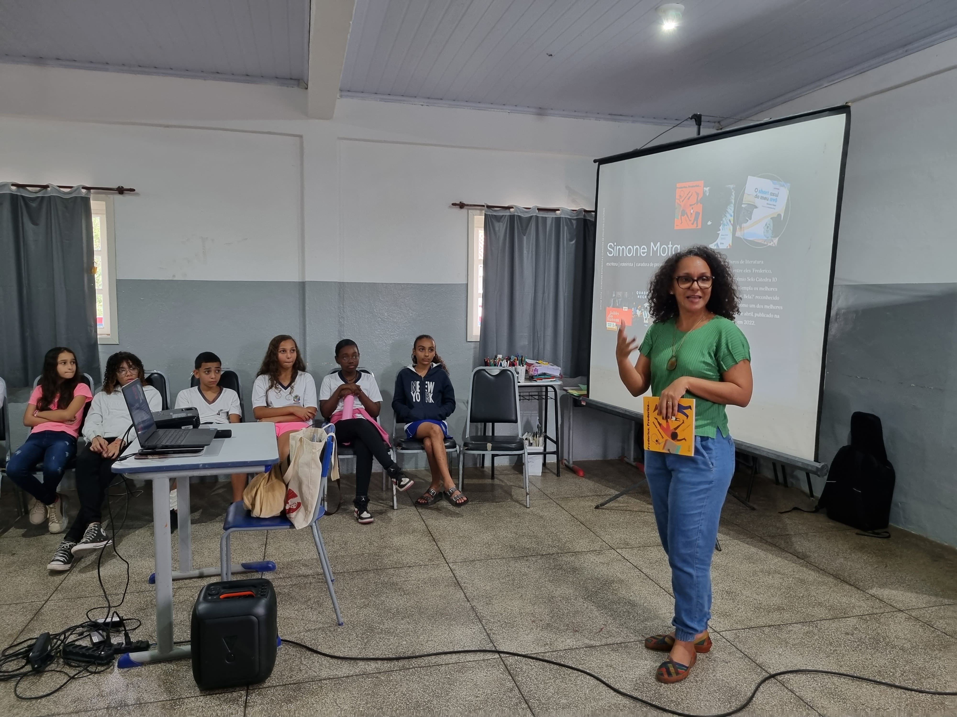 A escritora Simone Mota foi a autora convidada do Educativo Flip para a ‘Operação Flipinha’ em 21 de maio e protagonizou encontros com estudantes da Escola Municipal Parque da Mangueira, em Paraty. Crianças do 5º e 6º anos participaram das atividades de manhã e de tarde e tiveram a oportunidade de aprender a respeito da criação literária e das profissões envolvidas em todo o processo de publicação dos livros.