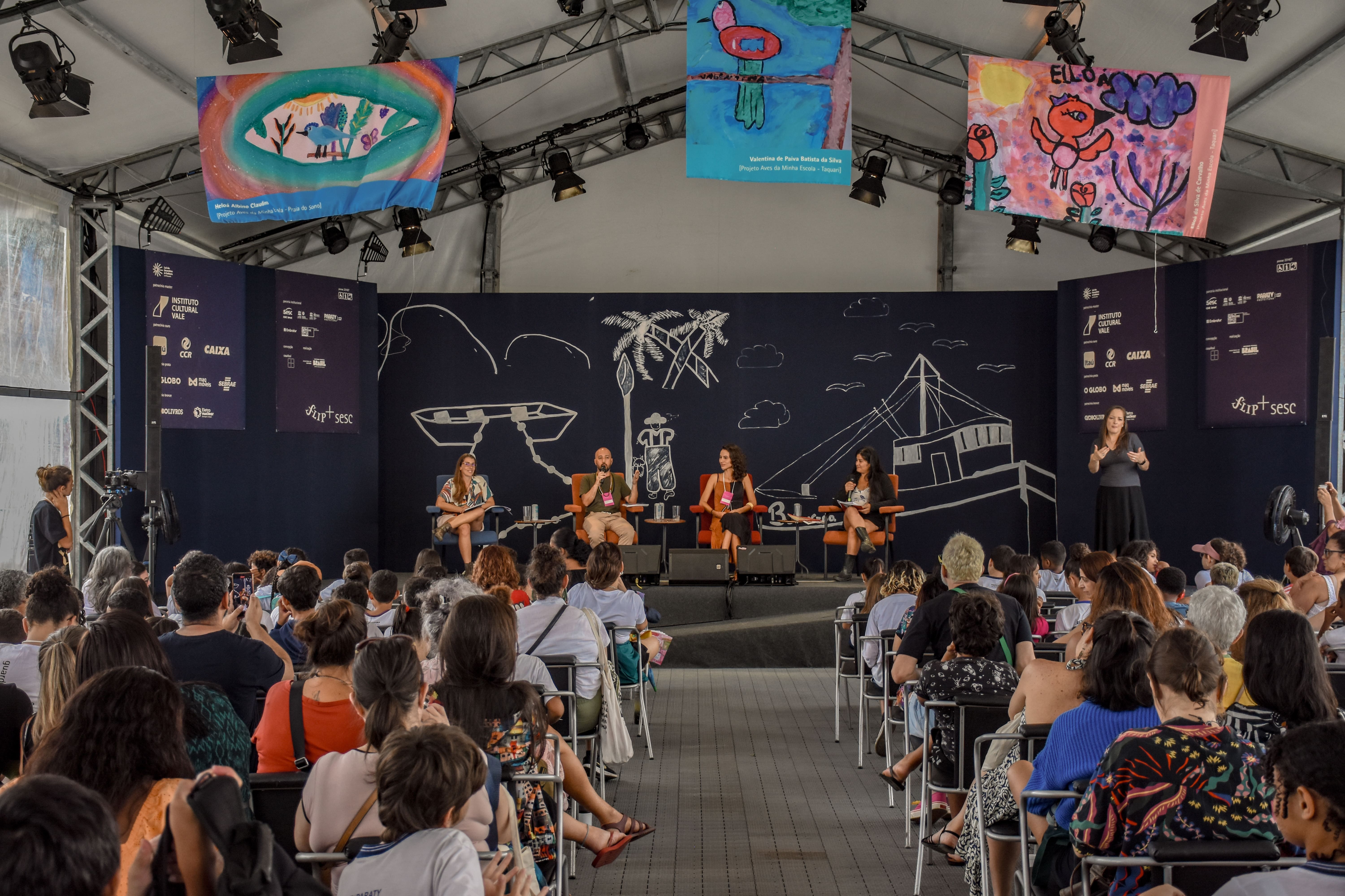 A roda de conversa ‘oS sentimentoS noS habitam’ reuniu a autora Roberta Malta e o autor Marcelo Maluf para conversar com as mediadoras Júlia Schmidt e Wara Merlo e a plateia lotada de estudantes de todas as idades no Auditório da Santa Rita. Educadoras e educadores de escolas públicas de Paraty e de Angra dos Reis vieram com crianças e jovens para conhecer as obras e participar da programação do Educativo Flip+Sesc.