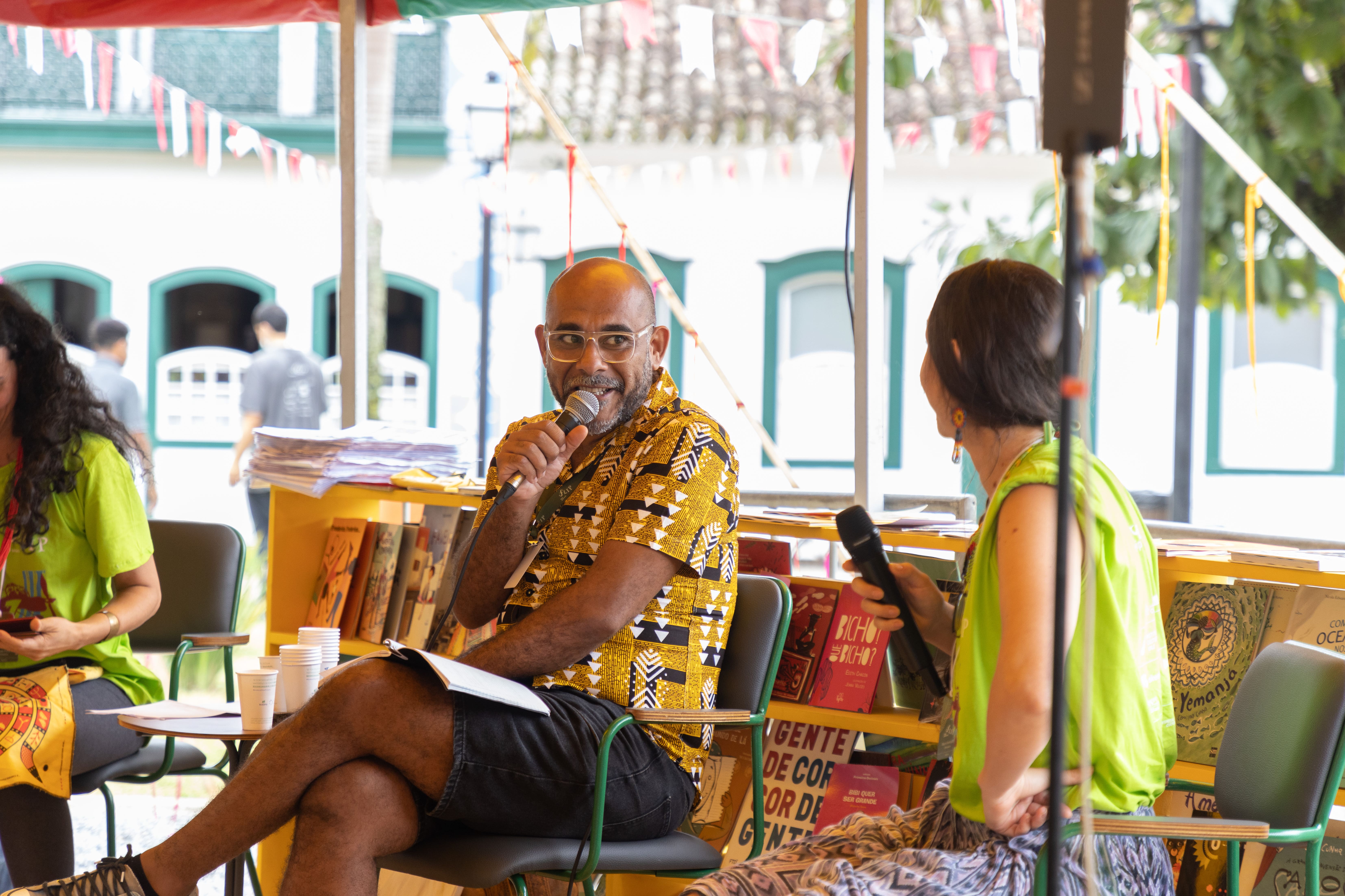 A mediação da mesa foi feita pela Mayra Fontebasso e pela Paula Lemes, moradoras de Paraty, participantes do Percurso Formativo Sementes, realizado pelo Educativo Flip, com coordenação de Denise Col.